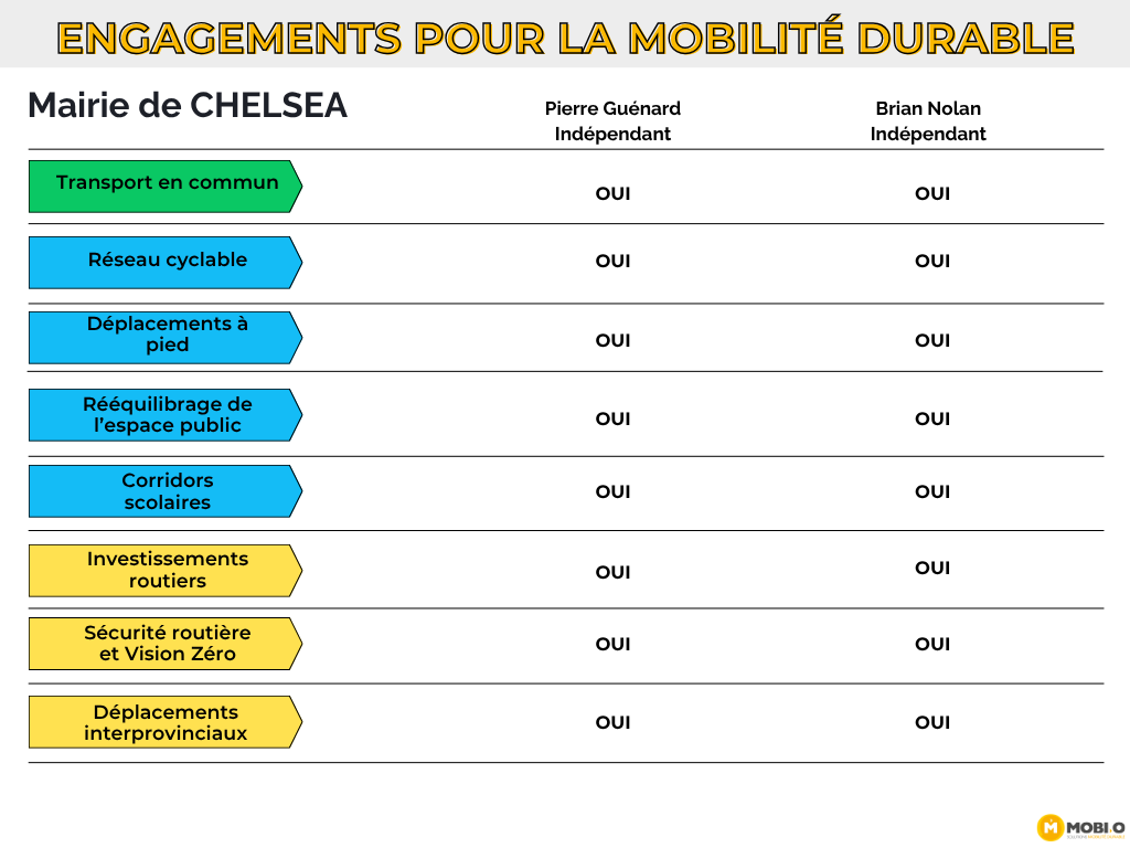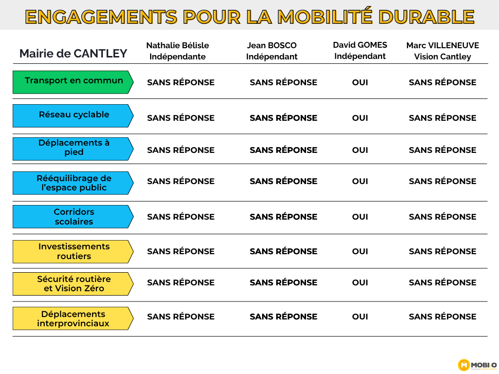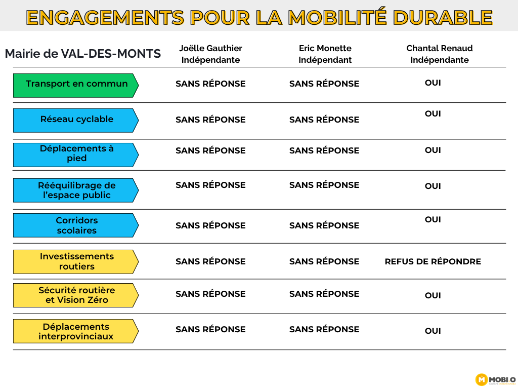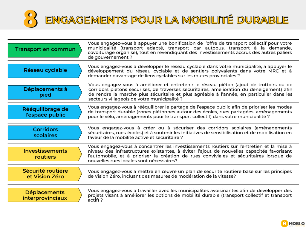 Afin d’assurer une information claire et accessible au public, le questionnaire proposait des choix de réponses uniformes. Cette approche visait à éviter les formulations vagues, à faciliter la comparaison entre les positions et à appuyer le jugement des électrices et électeurs sur des engagements concrets. La démarche de MOBI-O est à la fois démocratique, pédagogique et non partisane. Les priorités présentées dans le questionnaire reposent sur une expertise développée depuis près de 15 ans par MOBI-O et ses partenaires partout au Québec, appuyée par le consensus des professionnels et des experts en mobilité et en aménagement du territoire, ainsi que par les meilleures pratiques observées dans d’autres villes comparables.