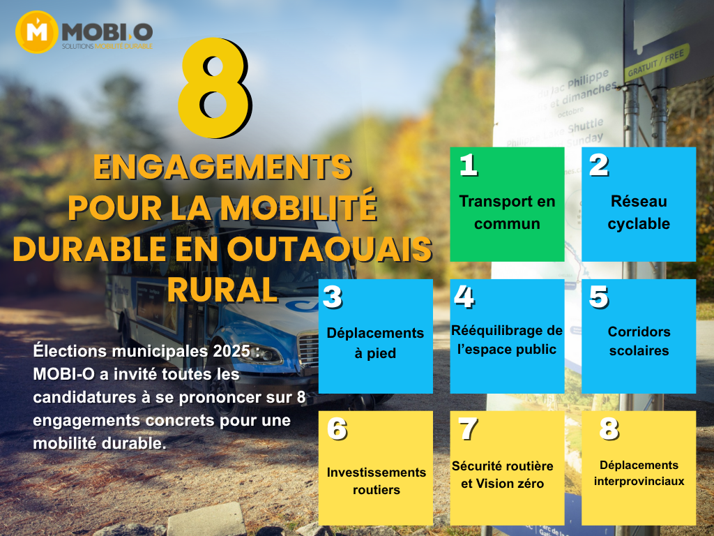 MOBI-O, le centre d’expertise en mobilité de l’Outaouais et de l’Abitibi-Témiscamingue, dévoile aujourd’hui les réponses des personnes candidates aux élections municipales sur les priorités en mobilité. La publication survient en prévision du début du vote par anticipation, ce dimanche 26 octobre, et du scrutin du dimanche 2 novembre prochain.